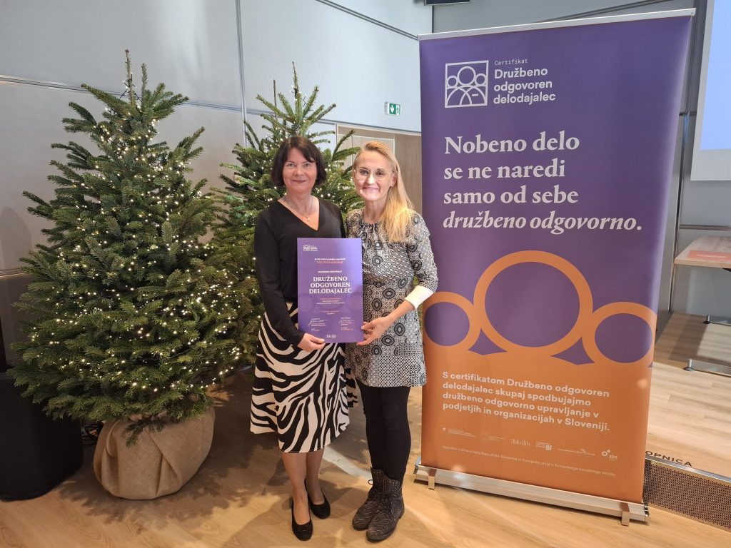 Maribor, 3. december 2025 – Varstveno delovni center POLŽ Maribor je uspešno pridobil napredni certifikat Družbeno odgovoren delodajalec – nivo 2, kar predstavlja pomembno priznanje